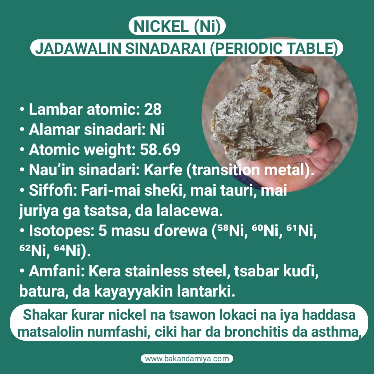 - da kuma haɓaka masana’antar alloys, musamman wajen ƙirƙirar ƙarfe mai ɗauke da nickel wanda ya fi juriya ga lalacewa da tsatsa.